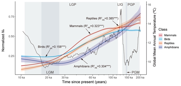 这项基于全基因组数据的陆生脊椎动物种群动态模拟研究揭示了在末次间冰期至末次冰盛期期间,所有陆生脊椎动物类群都经历了种群衰退过程。而末次冰盛期后,类群之间呈现分化趋势——鸟类和两栖类种群开始扩张,而哺乳类和爬行类则持续衰退。在倒数第二次冰期期间,除鸟类种群保持相对稳定外,哺乳类、爬行类和两栖类均表现出种群衰退特征。这表明,不同脊椎动物类群因特有的生物学属性差异,对冰期气候变化的响应模式产生了显著分异。