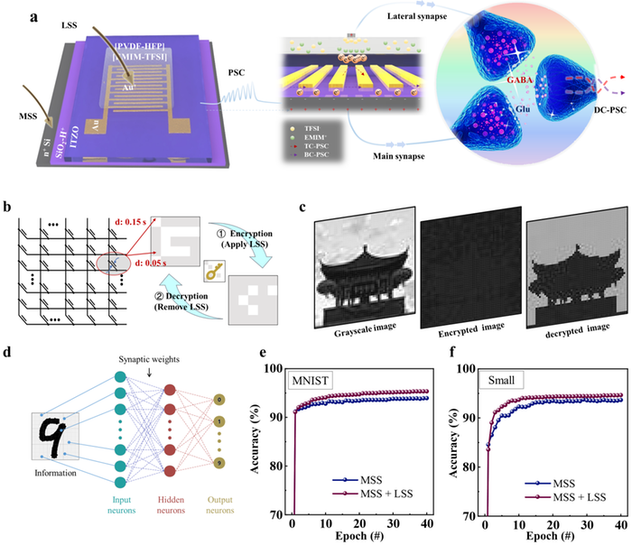 (a)模拟神经递质多级交织传递的非对称双栅极异质界面人工突触(HRAS)与真实生物突触示意图;(b, c)侧突触尖峰作为密钥构建的HRAS阵列进行图像加密和解密过程;(d-f)基于HRAS构建的主突触尖峰与侧突触尖峰双输入神经网络架构及模式识别演示。研究团队供图