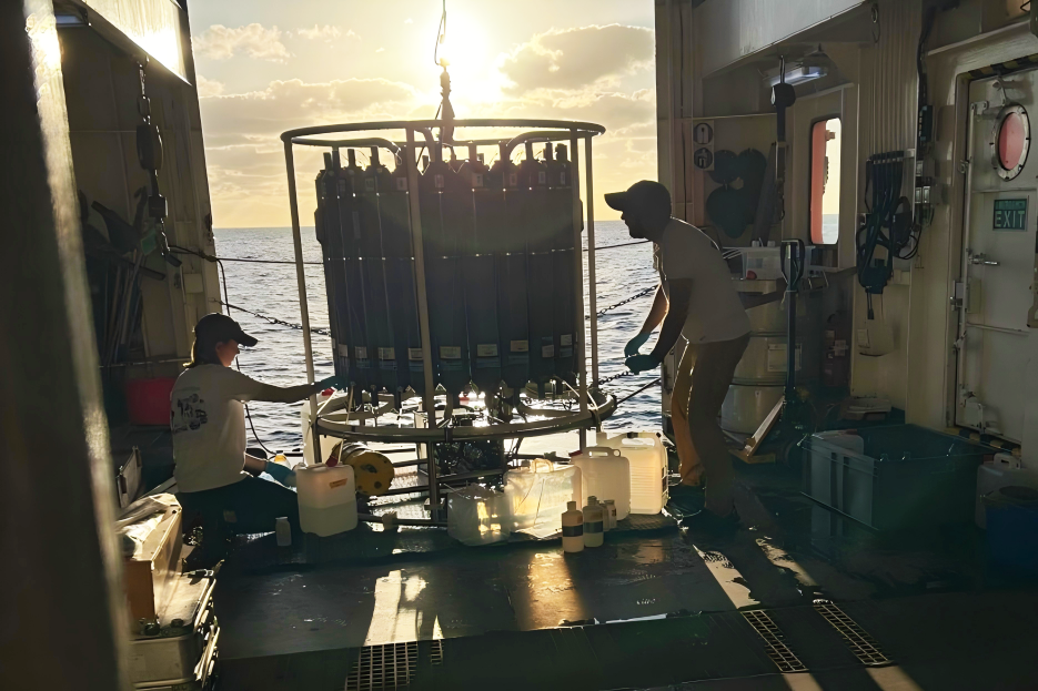 布雷耶(左)与巴尔塔(右)正在从大西洋采集海水样本。图片由上海海洋大学提供