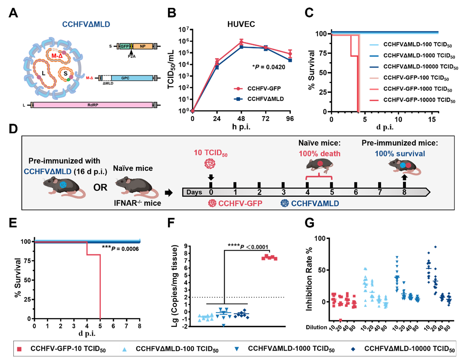 (A)缺失MLD的CCHFV(CCHFVΔMLD)示意图;(B)CCHFV-GFP和CCHFVΔMLD在细胞上的生长曲线相当;(C)高剂量CCHFVΔMLD感染小鼠不致死;(D)CCHFVΔMLD单次免疫对野生型病毒感染提供完全保护:保持100%存活(E),肝脏中病毒载量处于检测下限(F),且实验终点的血清具有中和效果(G)