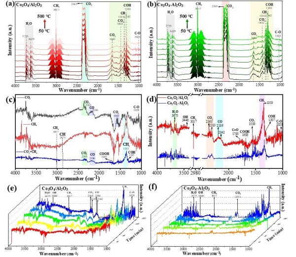 团队采用自制等离子体原位红外系统诊断反应关键中间体,结合表面密度泛函理论计算关键活性粒子吸附能,揭示了醇类化合物的产生机理。结果表明,脉冲放电等离子体活化CO₂/CH₄产生大量CO、OH和COH等活性粒子,氧化物界面加速了这些含氧自由基的界面吸附过程,促进了碳-碳耦合与加氢。