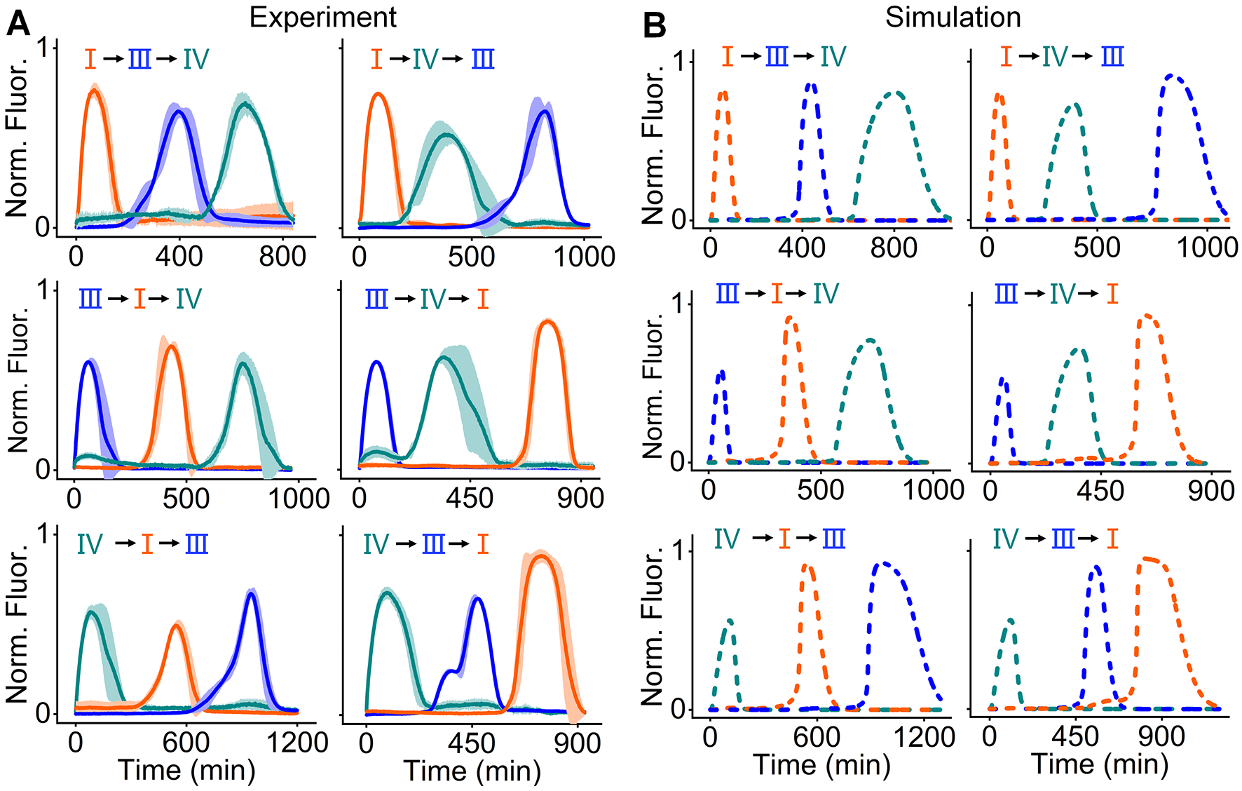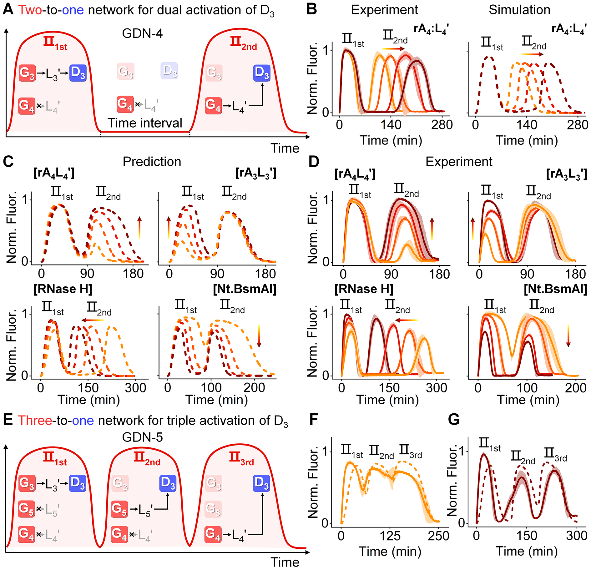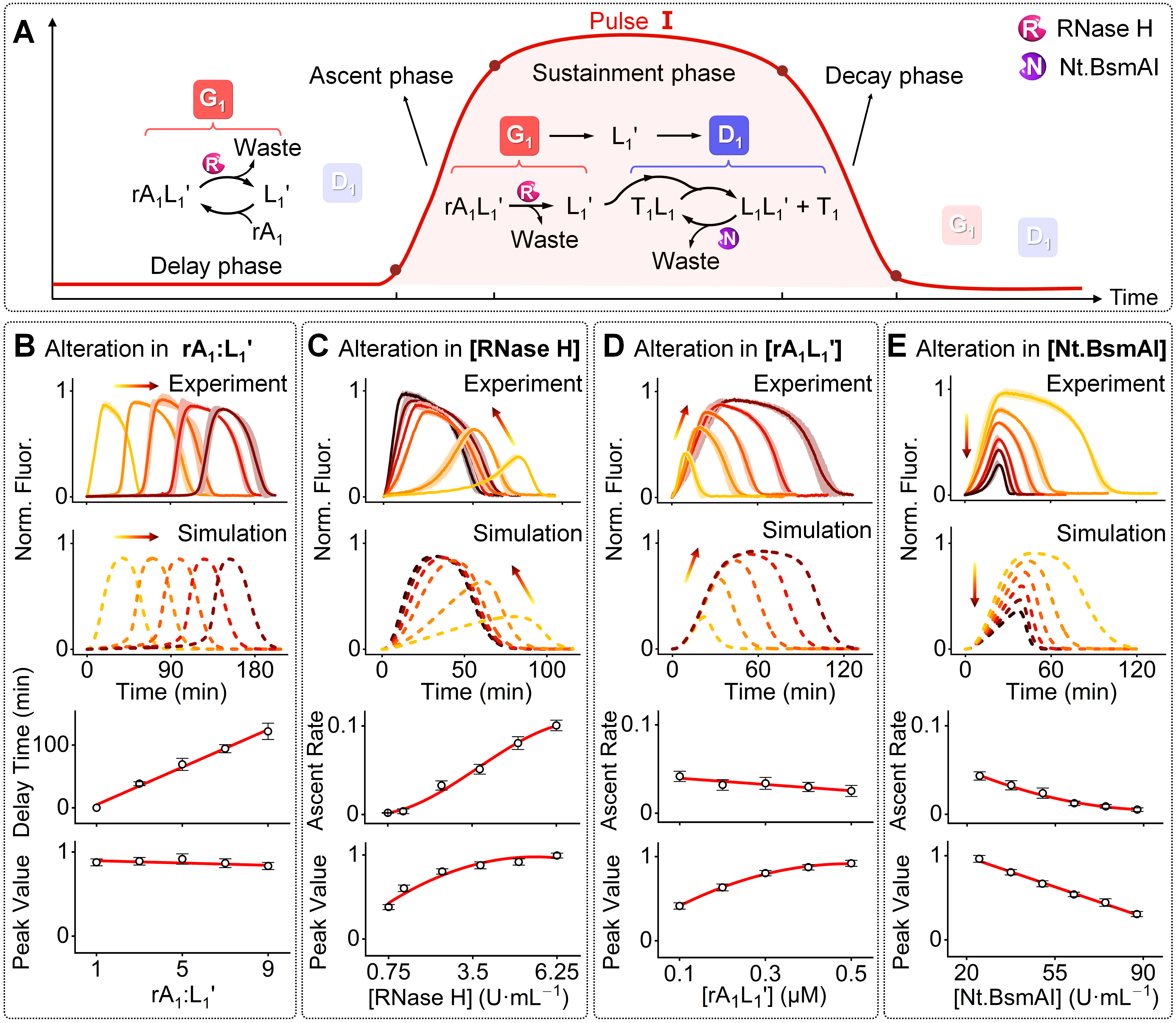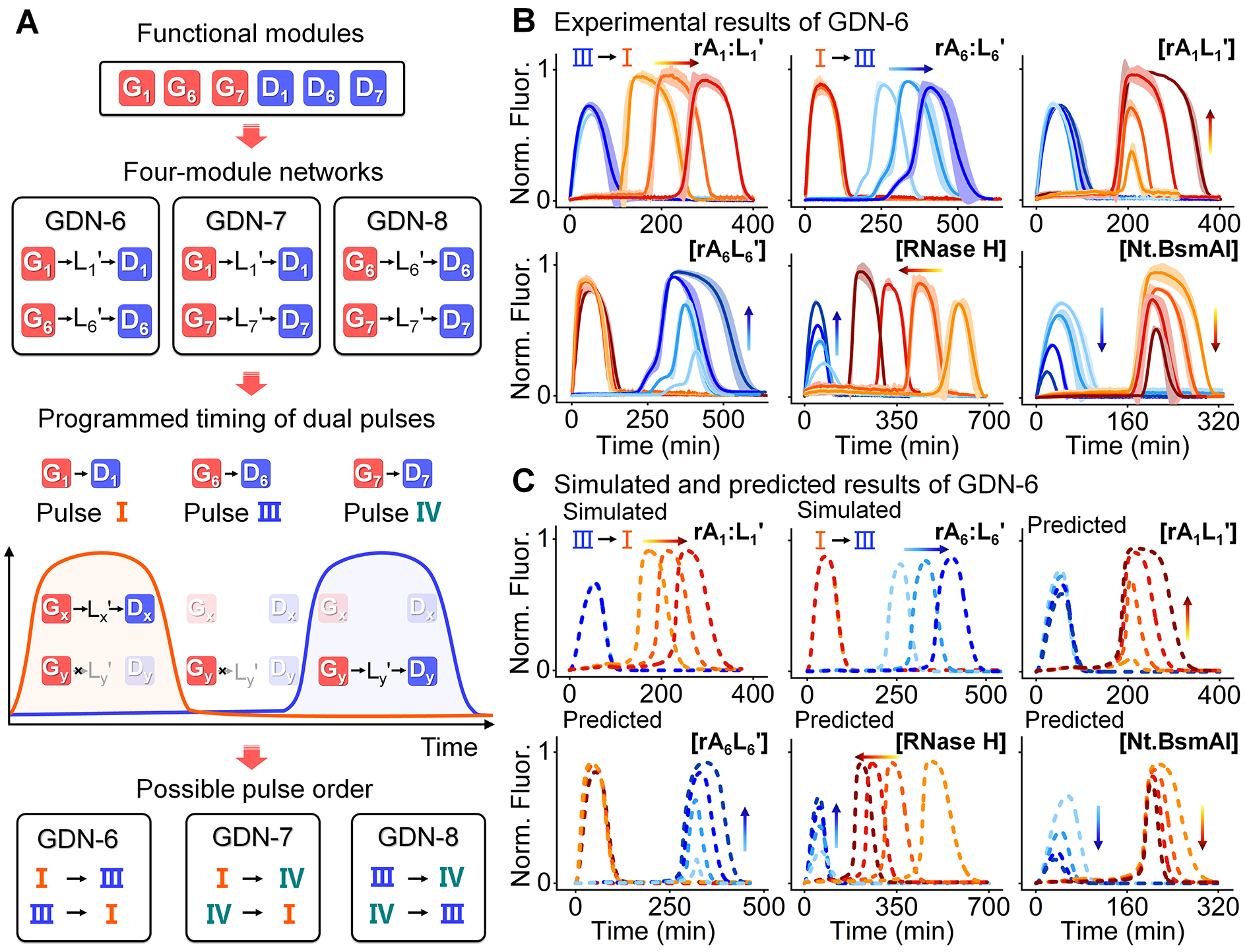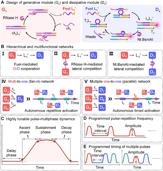 在这项工作中,团队创新性地引入了生成模块与耗散模块的组合策略。生成模块通过催化反应产生燃料分子,耗散模块则通过燃料的消耗触发可控的脉冲行为。通过灵活的模块组合、拓扑结构设计与层级构建,研究人员构建了一系列功能丰富的GDNs系统,实现了:(1)脉冲多相位调控;(2)重复频率可调的动态行为;(3)脉冲时序的精准控制。该系统的通用性和模块化特性,使其能够如程序代码般灵活编排,实现对复杂时间动态特性的可预测构建与调节。