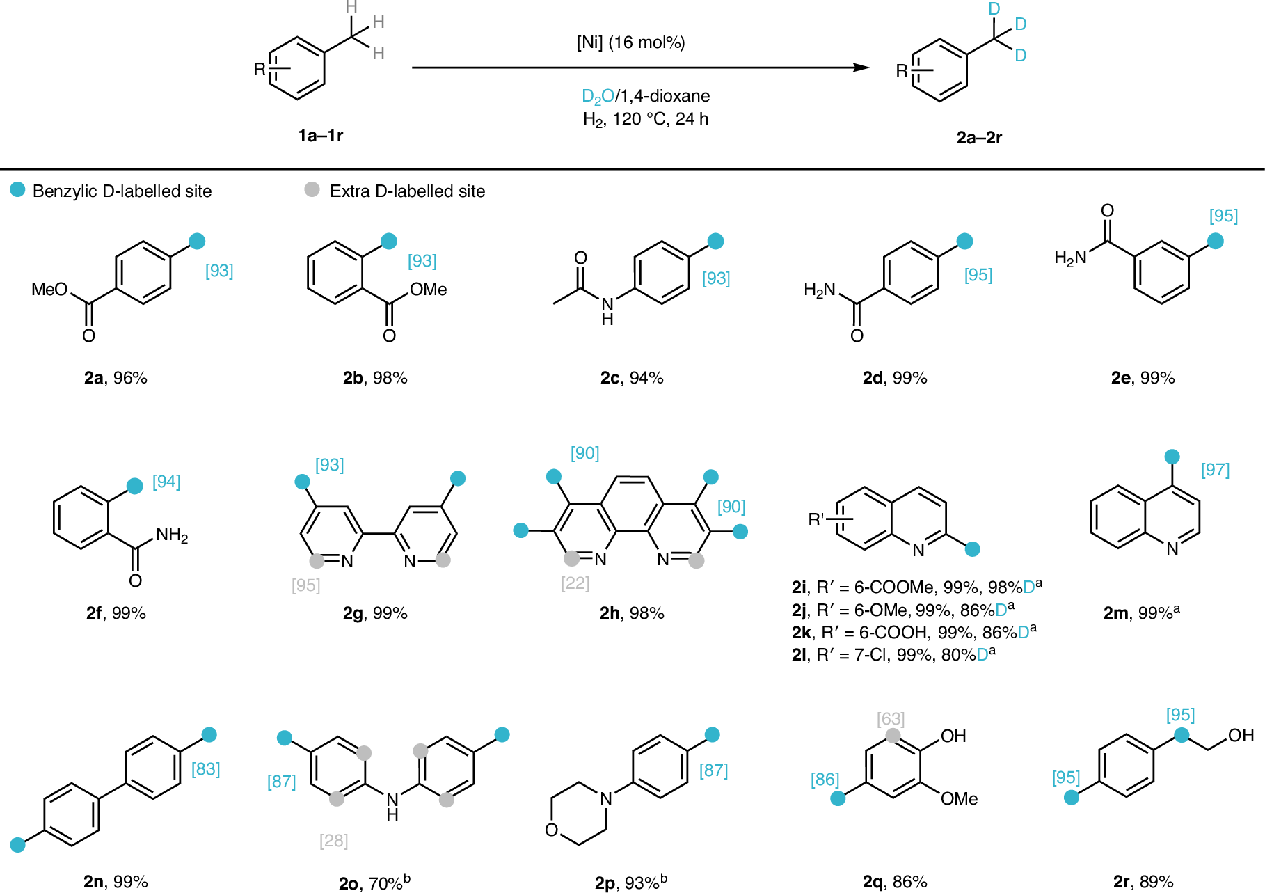 在这项工作中,雷爱文/李武团队通过调整添加的氮配体并借助H2等活性添加剂的辅助提高催化剂活性,成功实现了苄位C(sp3)–H键选择性氘标记。相较于之前的报道,该策略使用地球丰产金属和重水的组合替代贵金属与氘气,底物范围广,官能团耐受性高。值得提出的是,该方法还成功应用于天然产物和药物的后期氘标记修饰。