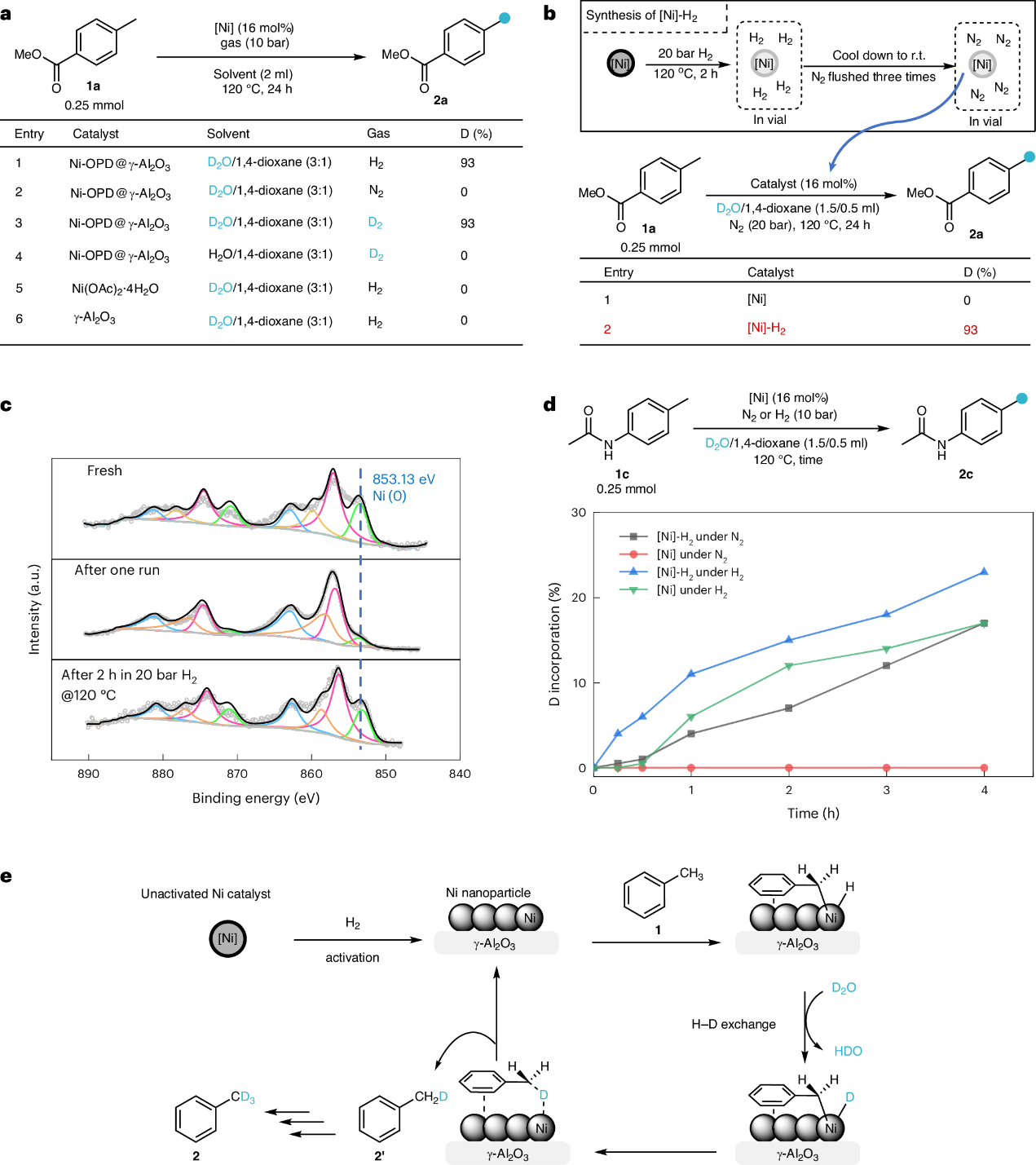 机理研究表明,反应过程中添加H2对同位素交换过程至关重要。体系中的H2作为活化试剂,可以使得催化剂表面生成低价态的活性镍物种,用于实现高效的苄位C(sp3)–H键氘标记。该研究不仅为苄位C(sp3)–H键氘标记提供了一种简便、绿色、高效的方法,同时开发的这种金属-H2-D2O体系预计可以应用于更多用于制备氘标记化合物的催化反应中。