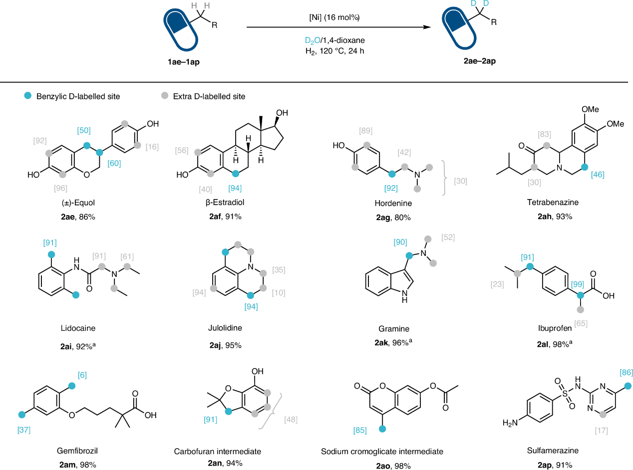 通过镍催化实现氘标记多种药物分子。 2025年5月22日,武汉大学化学与分子科学学院雷爱文/李武团队在Nature Synthesis期刊上发表题为Nickel-catalysed deuteration of benzylic C(sp3)–H bonds using D2O的研究成果。