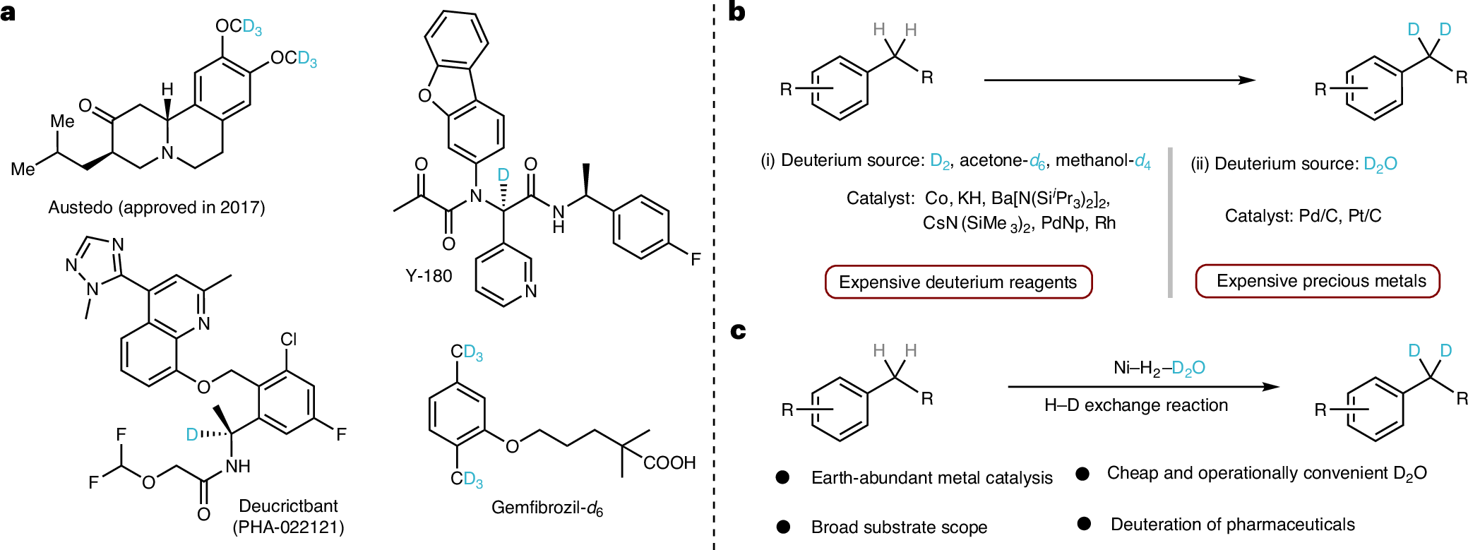 图1:氘标记化合物的应用以及苄位C(sp3)–H键上氢氘交换的方法。