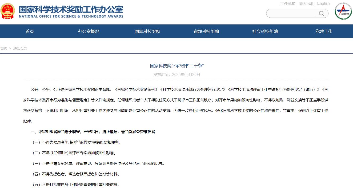 公开、公平、公正是国家科学技术奖励的生命线。《国家科学技术奖励条例》《科学技术活动违规行为处理暂行规定》《科学技术活动评审工作中请托行为处理规定(试行)》《国家科学技术奖评审行为准则与督查规定》等文件均规定,任何组织或者个人不得以任何方式干扰评审工作正常秩序、对评审结果施加倾向性影响,不得以贿赂、利益交换等不正当手段谋求获奖资格,不得利用组织、承担评审相关工作之便参与可能影响评审公正性的活动安排。为进一步净化评奖风气,强化国家科学技术奖的公正性和严肃性,特重申、强调以下评审工作纪律。