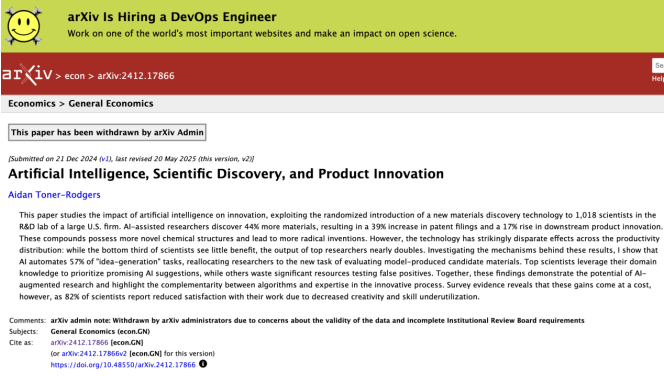 为纠正研究记录,MIT纪律委员会已致信arXiv,正式要求撤回该论文,并联系了该论文曾投稿的《经济学季刊》。
