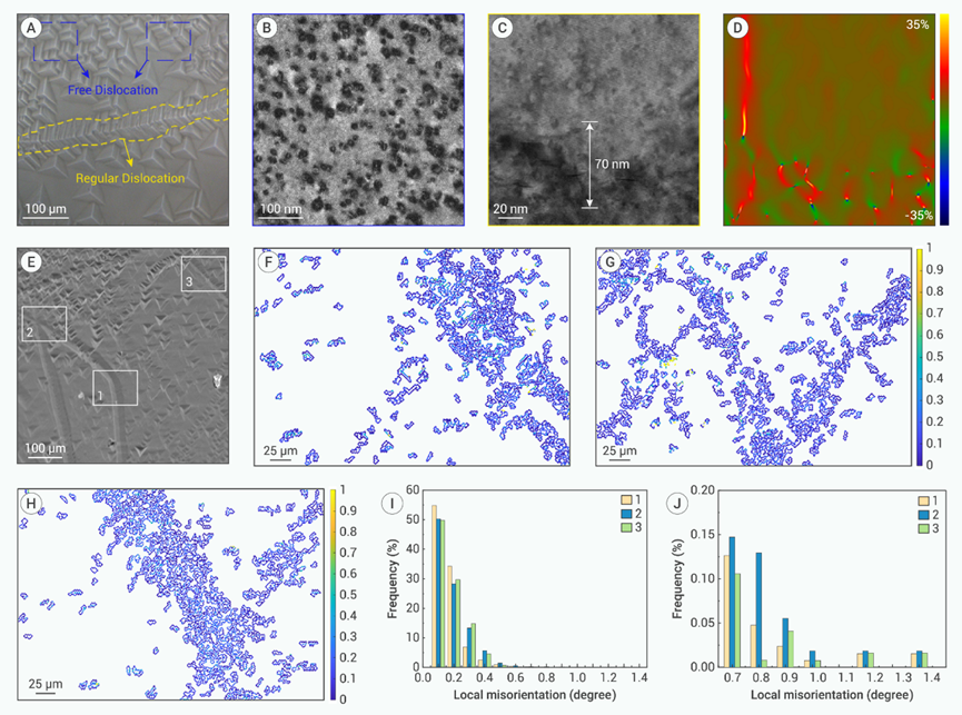 对此,中国科学院上海硅酸盐研究所研究员苏良碧和副研究员张博团队针对氟化钙晶体位错原子级表征技术瓶颈,构建了“化学腐蚀法-高分辨电子背散射衍射技术(HR-EBSD)-积分差分相位衬度扫描透射电子显微技术(iDPC-STEM)”多尺度联用表征体系。研究通过开发基于菊池线旋转补偿算法的高分辨EBSD技术,突破了传统EBSD精度不足的瓶颈,并结合化学腐蚀法,实现了晶体中“自由分布”与“规则聚集”两类位错精准定位与微小取向差表征。同时,研究采用超低剂量iDPC-STEM技术,首次在原子尺度直接解析了F/Ca原子排列,并清晰捕获位错真实构型。