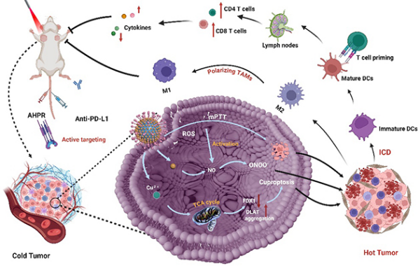 研究人员进一步利用荧光-光声成像可视化技术,揭示了该智能响应抗肿瘤药物递送体系的作用机制。研究结果表明,AHPR组装肿瘤靶向肽,可主动识别并富集于肿瘤部位,实现高效靶向递送。在近红外光激发下,通过温和光热、铜死亡和ONOO‑产生等机制,AHPR调控肿瘤免疫微环境,促进DCs成熟,增强T细胞的浸润和巨噬细胞极化,诱导免疫原性细胞死亡,将“冷”肿瘤转化为“热”肿瘤。值得注意的是,AHPR可与免疫检查点抑制剂(αPD-L1) 结合,进一步增强免疫应答率,改善肿瘤治疗效果。