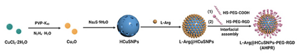 近日,中国科学院兰州化学物理研究所研究团队与新疆大学合作,针对传统抗肿瘤药物递送系统的局限性,发展了一种“高效靶向+刺激响应+光热协同”智能响应抗肿瘤药物递送材料。研究人员将一氧化氮供体L-精氨酸(L-Arg)负载到具有近红外吸收的中空硫化铜纳米颗粒(HCuSNPs)中,并与肿瘤靶向肽(RGD)组装,合成AHPR智能纳米递送材料。体外和体内实验表明,在近红外光激发下,AHPR产生热效应,诱导纳米结构降解并释放铜离子和一氧化氮,提高血管通透性,促进药物深度渗透。同时,协同触发光热治疗、铜死亡及活性氧/活性氮风暴,实现高效抗肿瘤效果(体积减少90%)。
