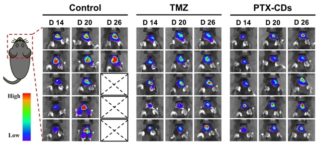 图3.紫杉醇衍生碳点在同源小鼠原位胶质瘤模型中的抗肿瘤效应