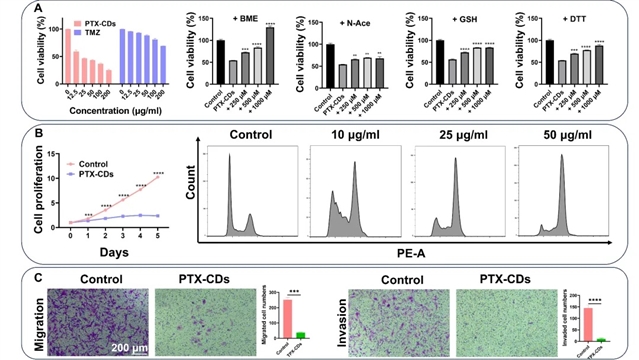 图2.紫杉醇衍生碳点在体外诱导细胞氧化应激死亡,抑制细胞增殖、迁移与侵袭