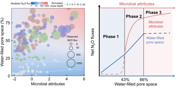 中国科学院植物研究所刘玲莉研究组以内蒙古温带草地为研究对象,依托长期野外增雪实验平台,利用原位高频温室气体监测设备,实时追踪N2O排放通量,并结合多种草地类型土柱微宇宙培养实验,探讨了冬季增雪条件下,冻融过程驱动N2O排放的生物与非生物机制。研究发现,冬季增雪会显著促进冻融期N2O脉冲排放,持续约50天的冻融期贡献了超过全年50%的总排放量。同时,冻融期N2O脉冲表现出显著的空间异质性,排放通量在3–1100 μg N m-2 h-1范围内波动。尽管存在显著的时空变异,但这一变异可由水分‒微生物共同驱动的层级调控机制来解释:当充水孔隙度(WFPS)小于43%,土壤水分为主要限制因子;当充水孔隙度在43%–66%时,水分与微生物特性(反硝化基因丰度、氮转化酶动力学参数和微生物生物量)协同驱动;当充水孔隙度在66%以上,微生物功能(尤其氮转化酶活性)成为唯一控制因素。