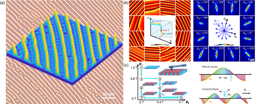 (a)大面积高定向斯格明子赛道阵列;(b) 方向调控;(c) 矢量场分步调控及原理