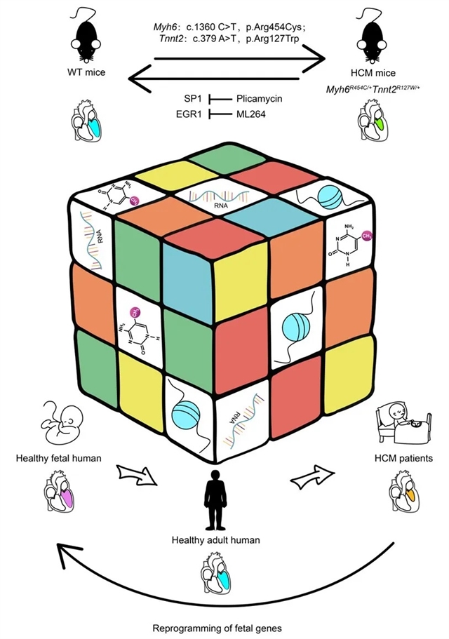 图示:如同图中的魔方所示,多组学(转录组、DNA甲基组和染色质可接近性)构成了一个高度互联的网络,在心脏发育与病理过程中共同发挥着重要且各异的作用。肥厚型心肌病(HCM)心脏展现出胎儿基因重编程现象,而抑制SP1或EGR1可减轻小鼠HCM的发展。