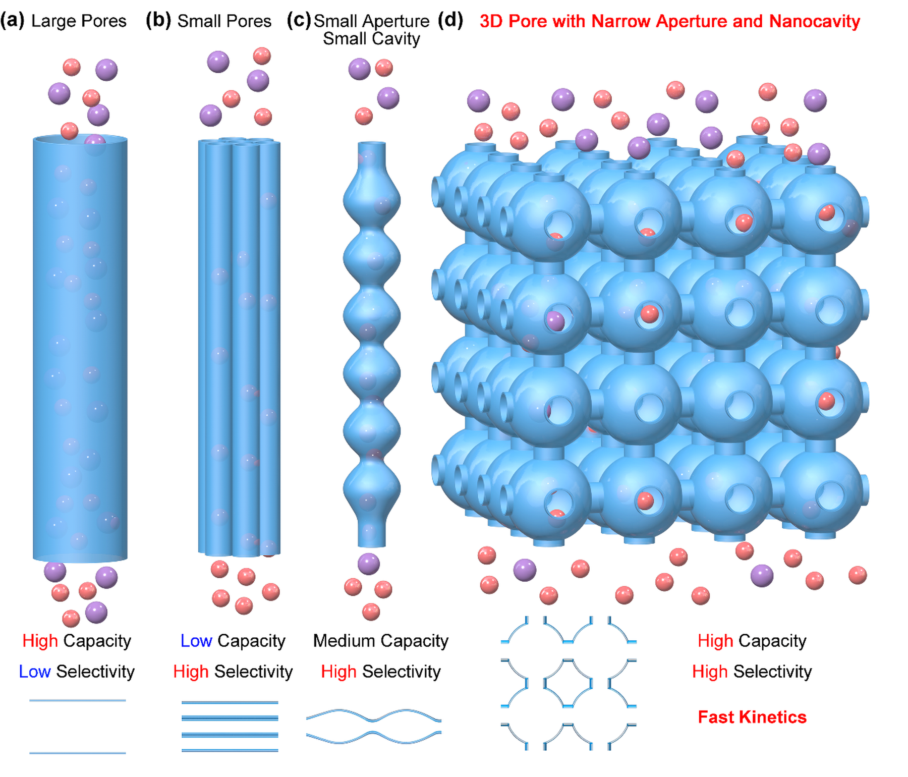 多孔材料中孔道结构调控的分离机制示意图。(a) 大孔:容量高,选择性低;(b) 分子筛:选择性高,容量低,动力学慢;(c) 小孔连接腔体:提升容量,保持高选择性;(d) 扩大腔体、限制孔口:兼顾高容量、高选择性和快速扩散。研究团队供图