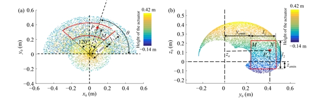 图2 图机械臂运动范围。 (a), 俯视运动范围;(b), 横截面。