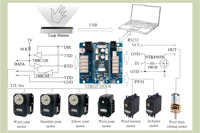 鲜果采摘作业劳动力需求大、机械化难度高,目前仍主要依赖人工。随着劳动力成本上升,发展智能化采摘技术成为迫切需求。现有基于机器视觉的自动采摘系统受复杂光照、果实遮挡等非结构化环境影响,识别精度和实时性难以满足实际需求。体感技术作为人机交互的重要手段,已在多个领域取得应用成果。在农业领域,Leap Motion等体感设备为机械臂控制提供了新思路,其手部交互方式相比Kinect更具操作便捷性。现有研究多集中于手势识别和机械臂控制算法优化,但在采摘作业中的应用仍有待深入。本文基于Leap Motion体感技术,提出一种人机协作采摘系统。通过建立多自由度机械臂运动模型,实现手部运动精准映射控制,并设计一键采摘指令交互模式。该系统充分发挥人类视觉优势,结合机器人作业能力,为复杂环境下的果实采摘提供了一种高效、安全的解决方案。