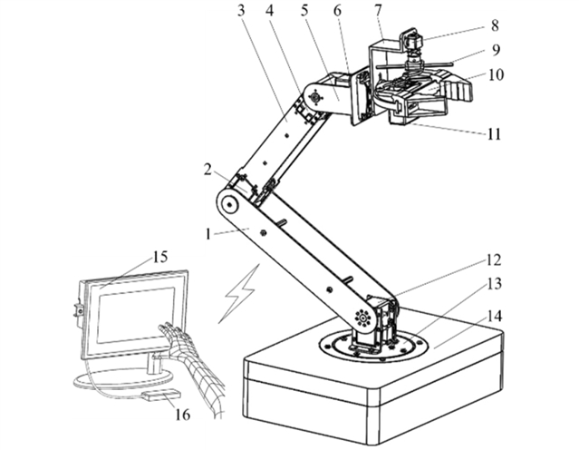 注:1, 大臂;2, 肘关节电机;3, 小臂;4, 腕关节电机;5, 前臂;6, 腕扭转关节电机;7, 支架;8, 果梗切割电机;9, 双刃割刀;10, 末端执行器;11, 末端执行器电机;12, 肩关节电机;13, 腰关节;14, 基座;15, PC机;16, Leap Motion。
