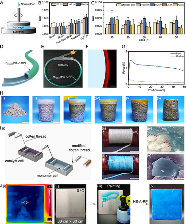 与传统光/热引发体系相比,HS-A-RP制备的聚两性离子水凝胶不仅具有更致密的网络结构和更好的机械性能,还展现出优异的抗溶胀、润滑、抗菌和防污性能。通过该种方法制备的聚两性离子水凝胶既能够作为功能涂层有效改善生物医用器械的表面润滑性,又能实现对热敏材料和砂砾的原位封装。此外,快速凝胶化和宽温域内可反应的特性,使HS-A-RP能够在不同基底表面和极端稳定环境条件下,规模化制备聚两性离子水凝胶涂层。