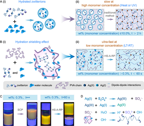 近日,中国科学院兰州化学物理研究所研究员周峰团队提出了基于一种基于“水合屏蔽”效应的聚两性离子水凝胶制备新方法——HS-A-RP,创新地将聚乙烯醇(PVA)作为水合屏蔽剂引入Ag+-S2O82-氧化还原催化体系中,实现了通用性两性离子单体在宽单体浓度范围(0.3-50wt%)、宽温域(-5℃-37℃)内的超快速聚合(t<60秒),且反应过程无需外部能量(紫外光/热)的输入。