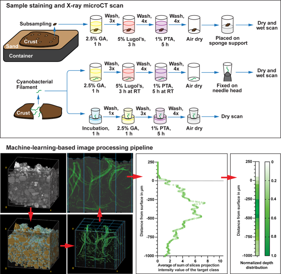 中国科学院新疆生态与地理研究所科研团队基于X射线断层扫描显微成像技术(X-ray microCT),通过样本染色处理,突破了生物土壤结皮中有机物成像后对比度低、难以分辨的难点,实现了生物土壤结皮结构与其中蓝藻生物量微米级分辨率的三维成像。同时,基于机器学习技术,团队开发了可精准识别生物土壤结皮X-ray microCT图像如土粒、蓝藻藻丝、EPS、孔隙等不同组分的半自动化图像处理流程,解决了人工图像处理耗时长、依赖肉眼主观判断识别等问题,实现了快速、高精度的图像数据解析。通过上述研究,该团队获得了生物土壤结皮在水分变化以及沙埋下的结构变化、生物量分布变化的in situ时间序列图像集,并对其进行了量化解析。