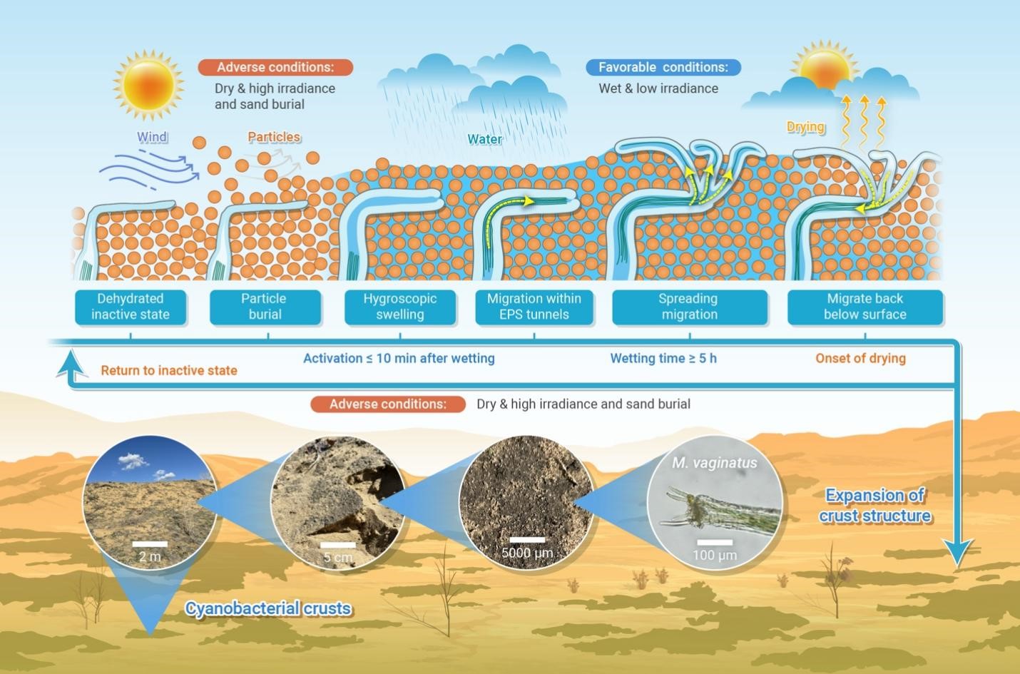 研究显示,具鞘微鞘藻作为藻结皮优势物种,可利用其分泌的EPS在藻结皮内部形成与其藻丝束共有胶鞘相连接的管状结构,将位于结皮表面下方约300μm的M. vaginatus藻丝束与结皮表面连通。为在干燥脱水的藻结皮中M. vaginatus处于休眠静止状态,在藻结皮复水数分钟内,M. vaginatus即可以藻丝束为集体的形式通过管状EPS结构向地表运动。这些EPS管状结构为M. vaginatus的滑动运动提供了既有的EPS基质,降低了其滑动成本。EPS作为物理屏障,其内部形成含水量的梯度并对藻丝运动进行导向,使其在藻结皮湿润期间向地表运动以及在干燥时反向返回结皮内部。EPS管状结构更大的水力半径可协助蓝藻在小降雨事件和降雨初期获取水分,并通过其保水功能增加蓝藻响应干燥的时长,使荒漠蓝藻可在更加干旱环境中生存。