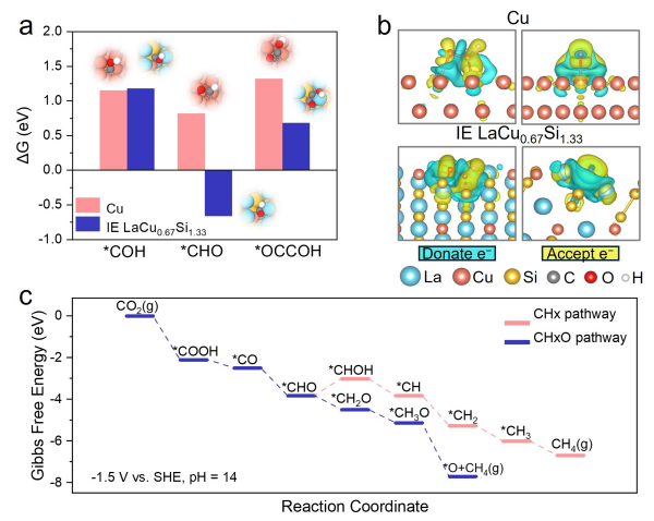 DFT计算(a)*CO反应系列中间物种在IE LaCu0.67Si1.33和Cu表面加氢和碳碳耦合反应的吉布斯自由能;(b)*CHO反应中间物种在IE LaCu0.67Si1.33和Cu表面的电荷密度差图;(c)CO2-CH4转变不同反应路径中间过程的吉布斯自由能。