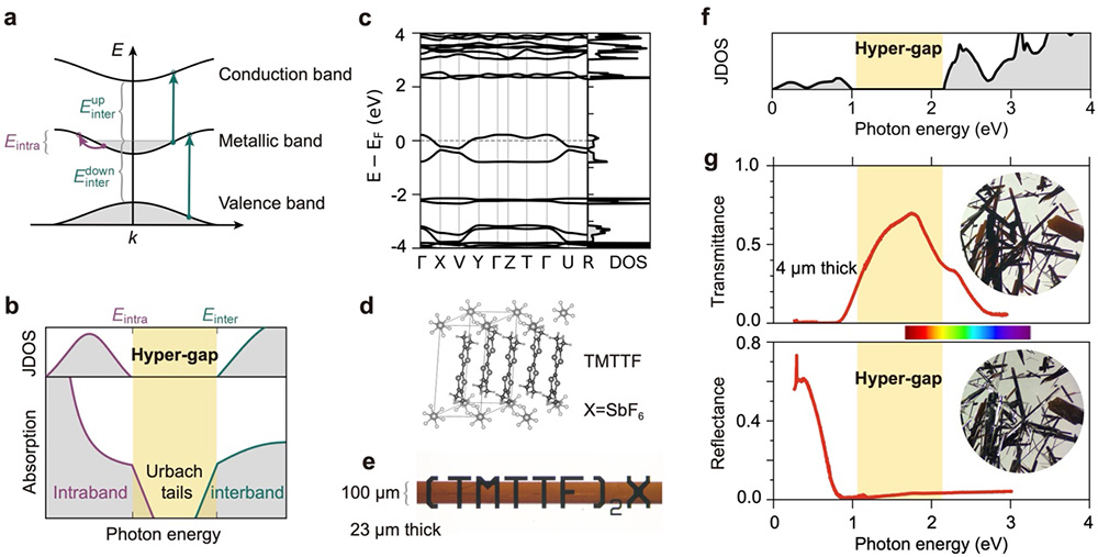 为寻找超带隙金属,该团队通过计算发现了一类已知有机导体 (TMTTF)2X可符合超带隙条件,并用电化学结晶生长了样品。研究表明,块体单晶在预言的超带隙波段展现出显著的透明窗口,其范围从可见红光至近红外,且在30微米厚度下能够透光。同时,其最低光学损耗(介电函数虚部)约为0.01,这一数值在已知化学计量比金属中最低,与商用透明导电氧化物薄膜(ITO)持平,且其色散与反射均低于ITO。