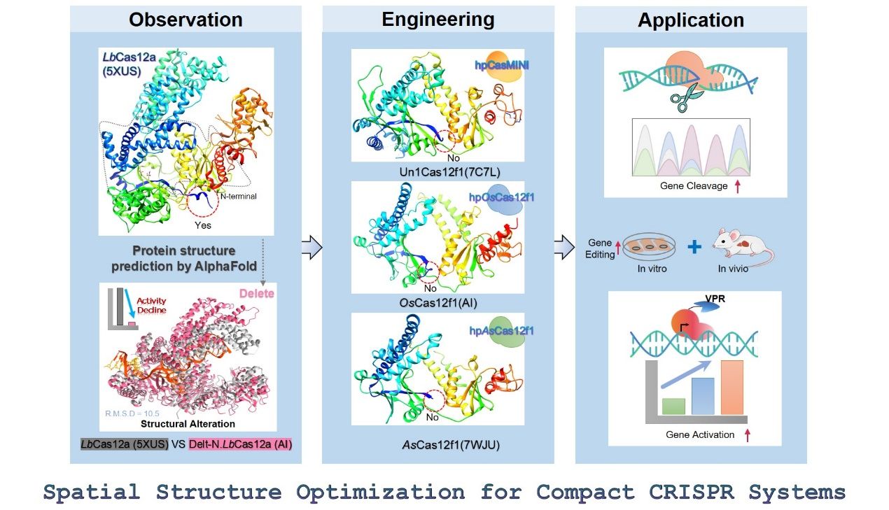 CRISPR-Cas系统作为一种基因编辑工具,因其高效性和精准性,在医学研究和疾病治疗中具有重要价值和巨大潜力。然而,传统CRISPR-Cas系统(如SpCas9和LbCas12a)体积较大,限制了其在腺相关病毒等载体中的包装效率,进而影响了其体内应用潜力。因此,开发体积更小、效率更高且特异性更强的基因编辑工具,已成为基因治疗领域亟待解决的科学问题,也是推动基因治疗技术走向临床应用的关键所在。Cas12f蛋白因体积小、递送效率高而备受关注,但其较低的编辑效率限制了其应用场景。