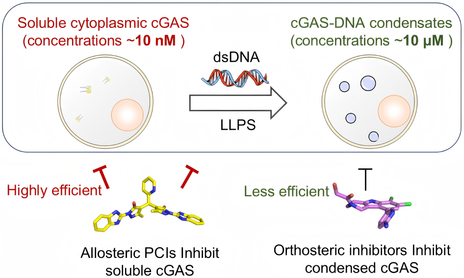 详细的机制研究表明,这类别构抑制剂能够明显减弱cGAS与DNA的结合,直接抑制cGAS-DNA相分离凝聚体的形成,因而也被称为蛋白凝聚抑制剂(PCI)。在特定条件下,XL-3156将原本类似固体纤维状的液-固相分离(LSPS)凝聚体,转变为流动性更强的液-液相分离(LLPS)液滴,表明其显著降低cGAS-DNA相分离的程度。