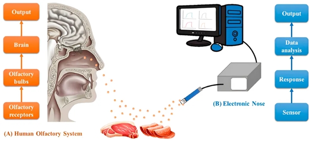 生物嗅觉系统 (A) 与电子鼻技术 (B) 的示意图