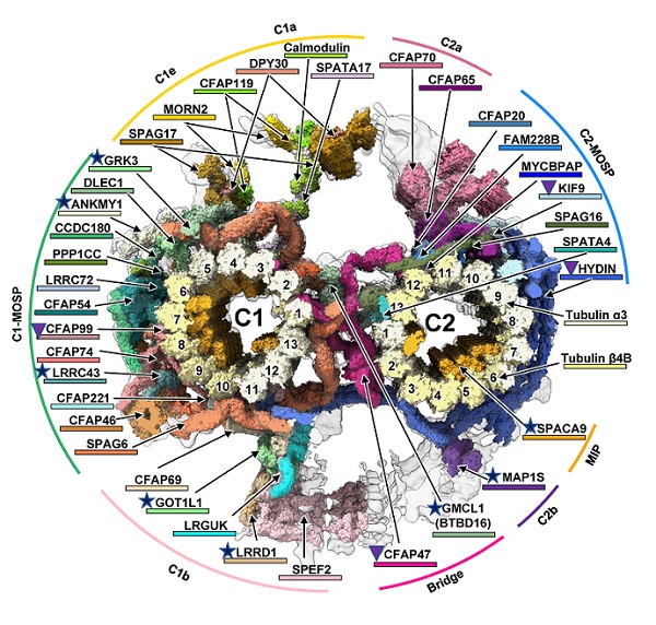 研究团队利用最先进的原位冷冻电镜技术,结合AlphaFold2等人工智能蛋白质结构预测技术,克服样品制备、数据采集和图像处理方面的技术难题,首次解析出小鼠精子轴丝中央微管的高分辨率原位结构(局部分辨率最高达5.5 埃)。该研究清晰呈现了C1-C2微管及其内外结合蛋白的组装模式,搭建出包含466个蛋白亚基的结构模型,鉴定出39种不同的组成亚基,其中8种(GRK3、ANKMY1、LRRC43、GOT1L1、LRRD1、MAP1S、GMCL1/BTBD16和SPACA9)为全新发现的精子轴丝中央微管组分。