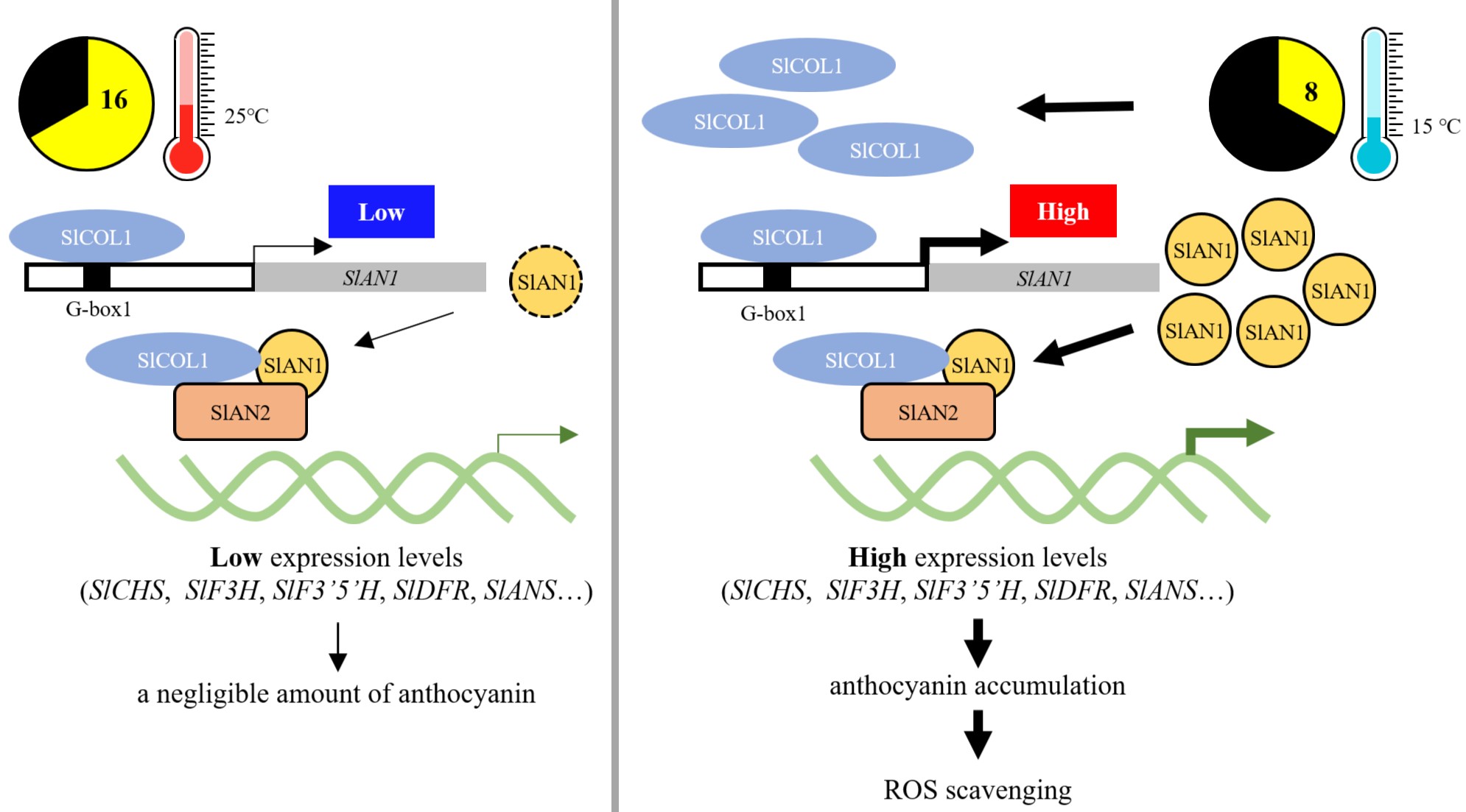 研究实验证明,SlCOL1可以与SlAN1相互作用,促进短日照下花青素合成结构基因的表达,进而促进花青素的生物合成。短日照环境常常伴随着亚适低温环境,例如北半球秋季。在短日照亚适低温(15℃)环境能够诱导SlCOL1表达水平上调进一步促进花青素的积累,积累的花青素有助于番茄清除活性氧,以适应秋季环境。(来源:中国科学报 朱汉斌)