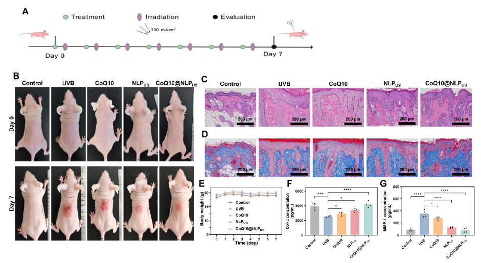 研究者通过中波紫外线 (UVB) 的照射建立了细胞和小鼠背部皮肤的光老化模型。对造模成功的细胞分别施加DMEM基本培养基 (阳性对照组)、CoQ10、NLPUS、CoQ10@NLPUS,24小时后对细胞进行分析。