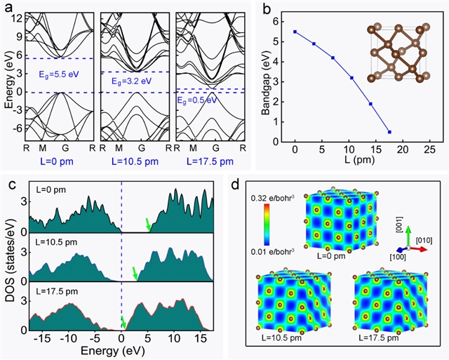 近期,中国科学院宁波材料技术与工程研究所成功制备了大尺寸 (9 mm×9 mm×1 mm) 新型单晶金刚石,X 射线衍射谱显示其与传统的立方金刚石具有明显区别,其具有较强的 (002) 衍射峰,表明其含有新型金刚石结构。研究人员利用球差校正透射电镜原子尺度表征,结合皮米精确原子识别技术和衍射模拟技术,发现并证明了金刚石原子发生了皮米尺度的不同程度的周期性定向偏移,并分析了原子偏移的物理机制,提出了新的结构模型(Subdisordered Structures),解释了新型金刚石结构特征。第一性原理计算表明,金刚石的带隙随着原子偏移距离的增加而迅速减小(当原子偏移17.5 pm 时,金刚石带隙从5.5 eV下降到0.5 eV),与实验结果(新型单晶金刚石电导率是传统单晶金刚石的106倍)一致,因此,皮米尺度原子偏移引起的带隙快速减小为调控金刚石电子特性提供了新思路。