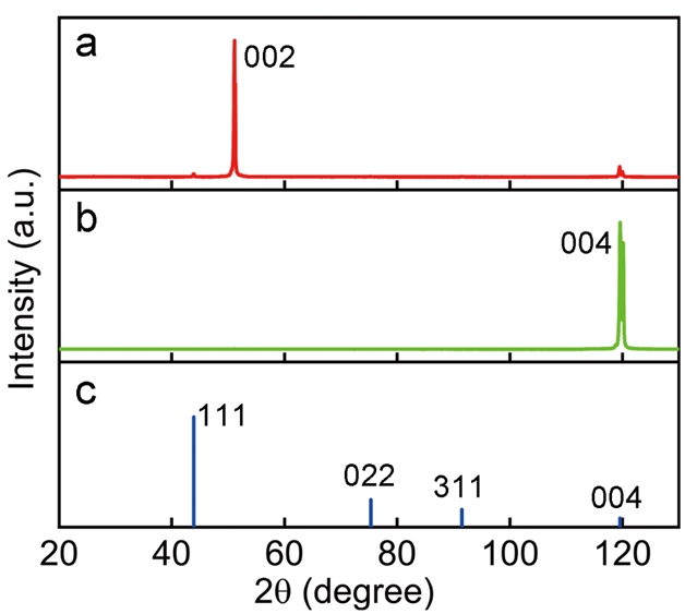 图1 新型单晶金刚石XRD衍射谱(a)、传统单晶金刚石XRD衍射谱(b)和传统金刚石标准粉末衍射谱(c)对比