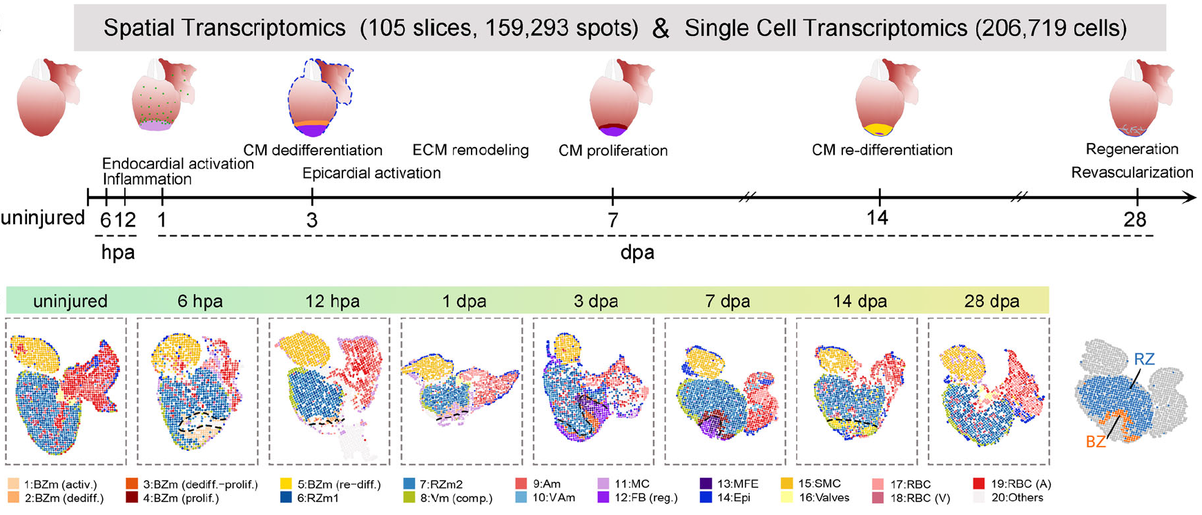 这就像给心脏做了一个动态的“3D基因地图”,不仅能知道损伤修复过程中有哪些细胞和基因活跃或沉默,还能精确定位它们发生这些变化的时间和位置。
