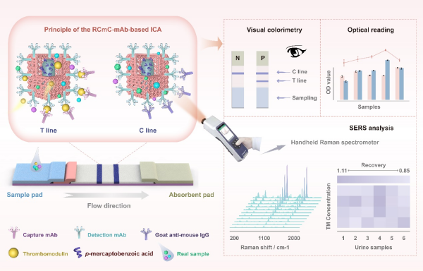 基于表面增强拉曼光谱技术的免疫层析传感研究取得进展。血栓调节蛋白(TM)是反映内皮功能障碍的关键生物标志物,但当前尚缺乏简便且快速的检测手段。例如,基于常规金纳米颗粒(AuNPs)的比色免疫层析法(ICA)因灵敏度不足,无法实现对痕量生物标志物的有效检测。研究表明,表面增强拉曼光谱(SERS)技术具有超高灵敏度,可显著提升ICA的传感性能。然而,传统等离子体纳米颗粒的比表面积较小,限制了抗体结合位点,不利于检测灵敏度的进一步提高。因此,开发兼具优异SERS活性与高效抗体偶联能力的新型纳米材料,对提高免疫层析分析性能具有重要意义。