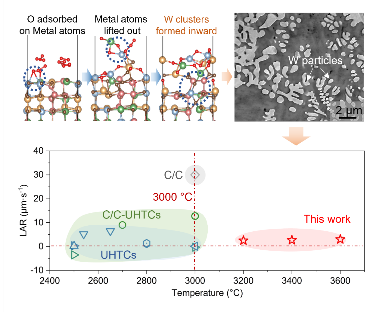 该材料的超高温抗氧化性能主要得益于生成的具有超高熔点的钨合金。相比其他元素,钨元素的表面氧原子吸附能最高,导致氧化难度最大,而除钨以外的其余元素则会优先氧化,并包裹于钨合金表面,进一步阻碍钨合金的氧化。在此原理基础上,钨合金弥散分布于氧化物层,可作为高熔点骨架,提高氧化物黏度,进而有效降低氧化物的高温挥发,阻碍氧气向内部基体渗透。
