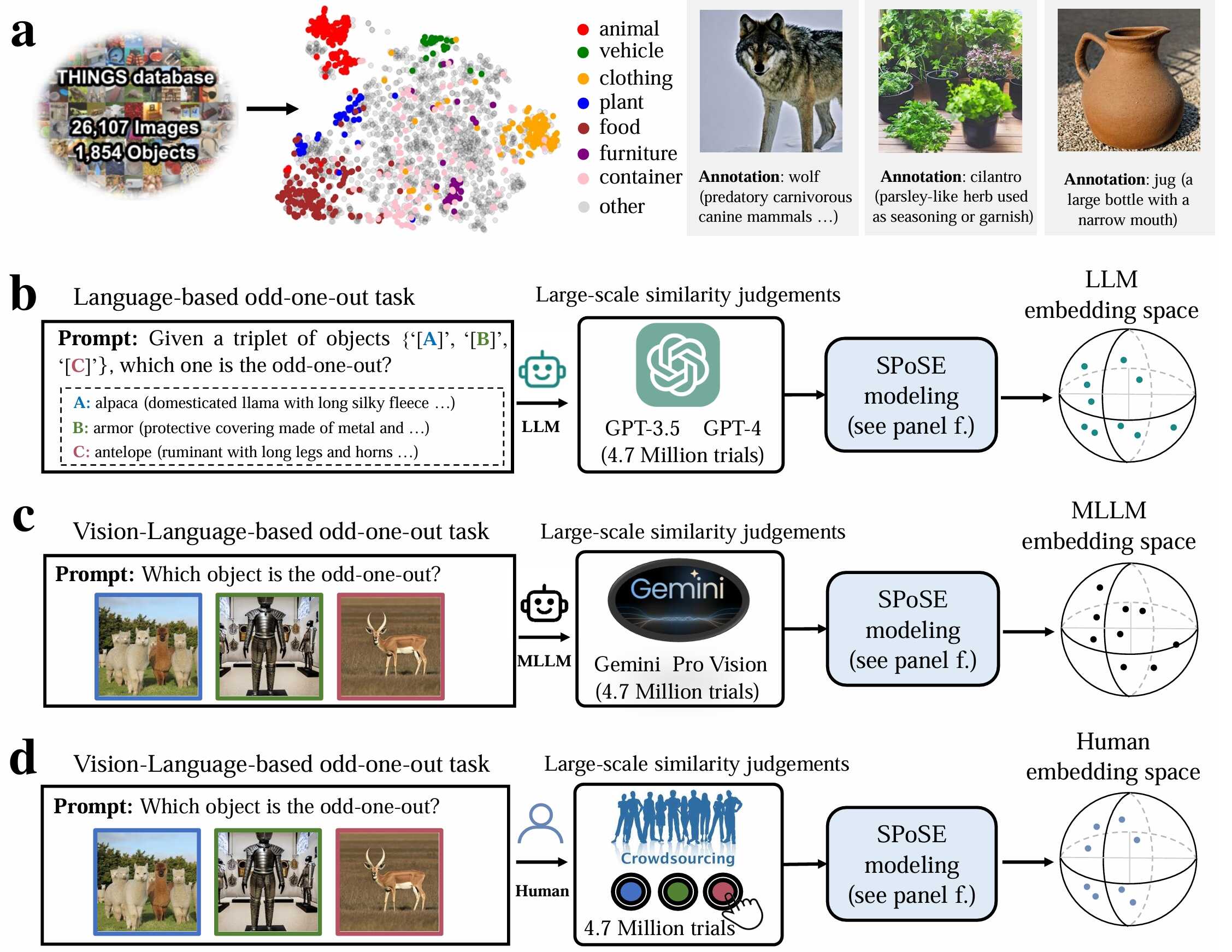 实验范式示意图。a,物体概念集及带有语言描述的图像示例。b-d,分别针对 LLM、MLLM 和人类的行为实验范式和概念嵌入空间。