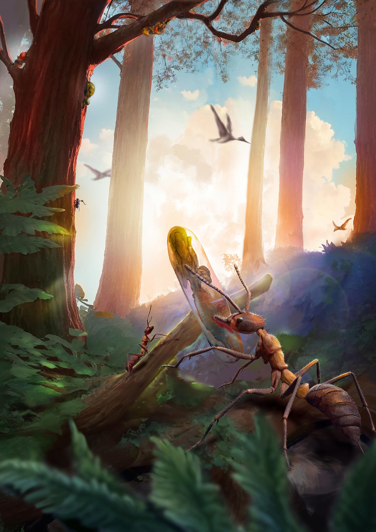 白垩纪时期蚂蚁、蝇类与古线虫草的古生态重建图。(杨定华绘制)