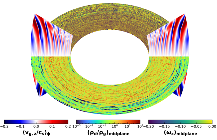 三维全局多流体模拟展示垂直剪切不稳定性、穿流不稳定性、罗斯贝波不稳定性及开尔文–亥姆霍兹不稳定性在原行星盘中可共存,形成多处高密度尘埃团块,为星子形成提供条件。