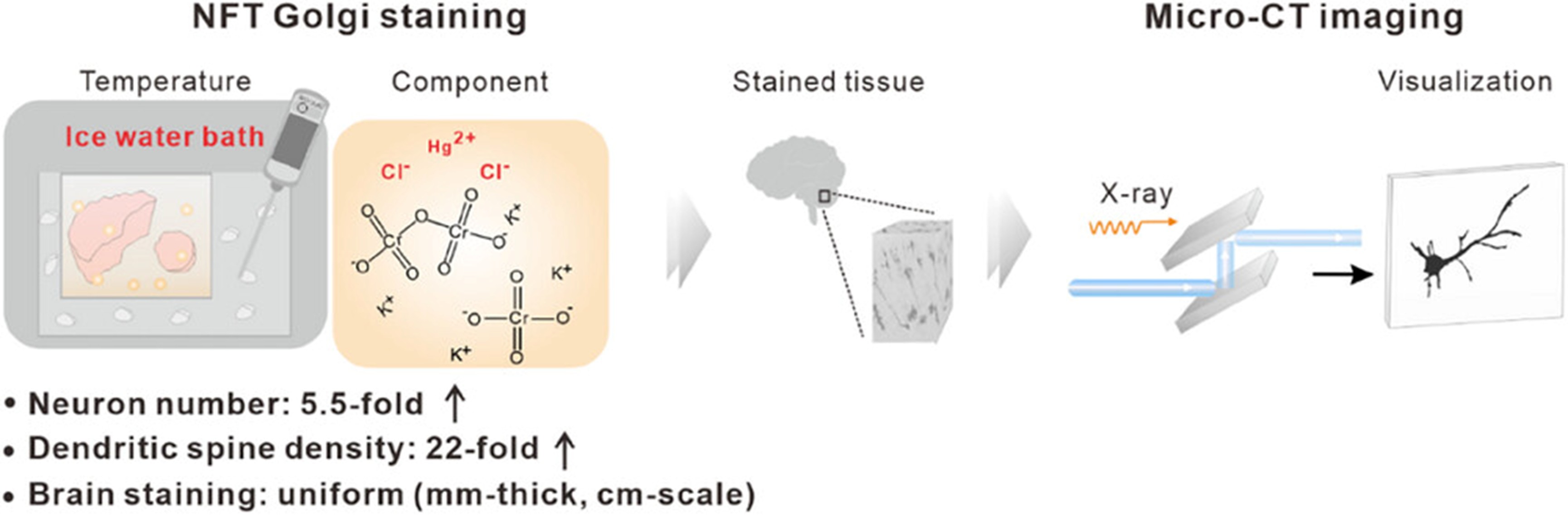 人脑神经元高保真染色与同步辐射X射线成像研究获进展br。长期以来,在人脑成像领域,获取大体积脑组织中的神经元结构信息是一项挑战。其核心难点在于染色效率与组织自溶矛盾,即刚离体的人脑组织难以获取且易快速降解,经典高尔基染色需在37℃或室温下促进染料扩散,但会加速组织自溶并损伤神经纤维结构。因此,亟需发展兼容低温条件的高效染色新方法,并兼顾保证神经元结构完整性与提升大体积样本染料渗透效果。