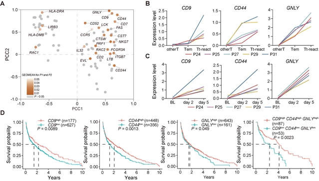 图5 CD9, CD44与GNLY可共同表征外周血中具备肿瘤反应性潜力的T细胞