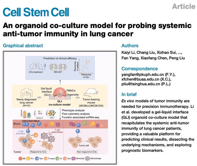 研究开发可模拟系统性抗肿瘤免疫的肺癌类器官共培养模型。 2025年6月12日,清华大学生物医学工程学院副教授刘鹏课题组在Cell Stem Cell期刊发表题为 An organoid co-culture model for probing systemic anti-tumor immunity in lung cancer 的研究论文。该研究建立了一种临床来源的肿瘤类器官胶-液界面式(Gel-liquid interface, GLI)共培养免疫模型,可有效模拟肺癌患者体内局部肿瘤微环境与外周免疫系统之间的互作。基于这一特性,该研究在借助共培养模型的免疫药敏响应准确反映肺癌患者临床免疫疗效的同时,依托多组学分析手段进一步揭示了模型中外周血来源的肿瘤反应性T细胞所参与的肿瘤免疫进程及其分子表达特征。