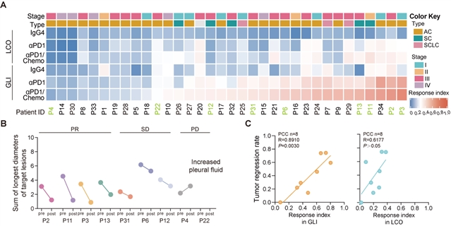 研究共建立了34例肺癌患者来源的GLI共培养模型,涵盖腺癌、鳞癌及小细胞肺癌亚型。通过评估免疫治疗(PD-1单抗或联合化疗)后的响应指数(Response index, Ri),发现Ri与患者实际临床疗效高度一致(R = 0.89)。尤其在9例接受真实免疫治疗的患者中,GLI模型可准确区分临床部分缓解(PR)、疾病稳定(SD)和疾病进展(PD)人群。相比之下,缺乏PBMCs的类器官单培养模型(LCO)未能有效预测疗效,提示系统性肿瘤免疫的模拟对于准确反映临床免疫疗效至关重要(图3)。