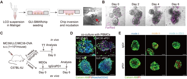 本研究设计了一种胶液界面式超疏水微阵列芯片(Gel-liquid interface superhydrophobic microwell array chip,GLI-SMARchip),在1.5 μL的液滴单元内构建LCOs与PBMCs的共培养体系。该模型使肿瘤类器官聚集于基质胶层表面,而PBMCs悬浮于上层培养基中,从而在胶-液界面形成稳定的空间接触,有效促进类器官与免疫细胞间的接触作用,从而模拟局部TME与系统性免疫细胞之间的协同关系。基于该策略所构建的小鼠及肺癌患者体外模型均呈现了良好的免疫细胞浸润与肿瘤免疫反应进程(图2)。