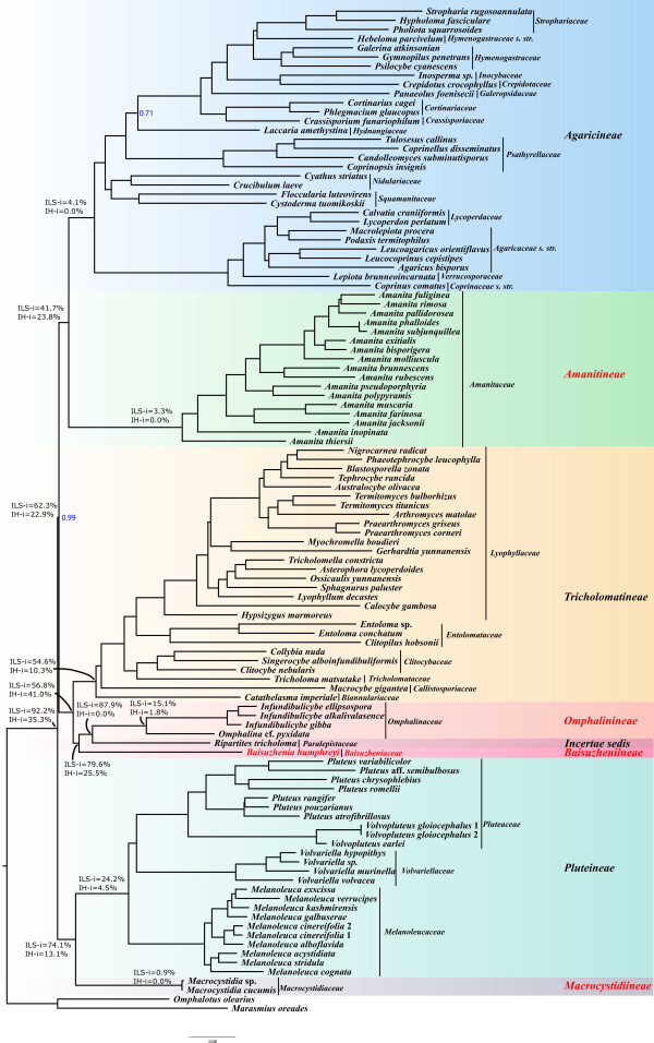 在此基础上,研究人员以蘑菇目Agaricales中系统发育冲突较为显著的蘑菇亚目Agaricineae-光柄菇亚目Pluteineae-口蘑亚目Tricholomatineae(简称“APT”)为研究对象,囊括了142个基因组(其中自测64个)数据,深度解析了其系统发育关系。Phytop分析表明,APT各亚目内存在广泛且强烈的不完全谱系分选和渐渗/杂交信号,其下各支系间的关系可能呈网状进化模式,二歧分支的系统发育树难以反映其真实的演化历史。整合系统发育分析结果、EQP-IC值和形态学特征,研究在原有ATP三亚目的基础上,新增了3个新亚目:鹅膏亚目Amanitineae、大囊伞亚目Macrocystidiineae和亚脐菇亚目Omphalinineae。此外,研究发现过去隶属于拟韧革菌目Stereopsidales的物种绒盖拟韧革菌Stereopsis humphreyi与APT亲缘关系较近,形成一个独立的支系。该研究为其建立了新亚目素贞菌亚目Baisuzheniineae、新科素贞菌科Baisuzheniaceae、新属素贞菌属Baisuzhenia和新组合素贞菌Baishuzhenia humphreyi。